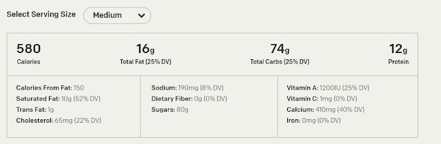 Original - Medium - A 16 ounce serving is 550 calories. 13 grams of fat, 8 grams of saturated fat, 1 gram of trans fat, 50 milligrams of cholesterol, 180 milligrams of sodium, no fiber, 82 grams of sugar and 13 grams of protein.